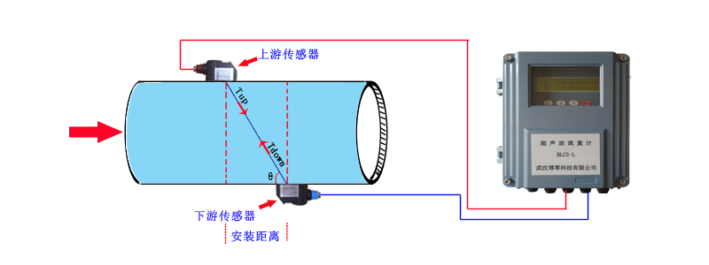 当超声波束在液体中传播时,液体的流动将使传播时间产生微小变化,其传播时间的变化正比于液体的流速,零流量时,两个传感器发射和接收声波所需的时间完全相同(唯一可实际测量零流量的技术),液体流动时,逆流方向的声波传输时间大于顺流方向的声波传输时间。其关系符合下面表达式: